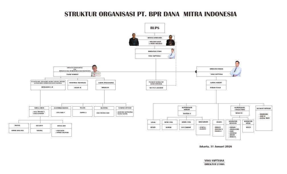 PT. BPR Dana Mitra Indonesia didirikan oleh dua orang pemegang saham perorangan, dengan modal dasar sebesar Rp. 20.000.000.000,- ( dua puluh miliar rupiah ) yang dibagi menjadi 20.000,- ( dua puluh ribu ) lembar saham dengan nominal perlembar saham sebesar Rp. 1.000.000,- ( satu juta rupiah ). Dari jumlah modal dasar sebesar Rp. 10.000.000.000,- ( sepuluh miliar rupiah ) atau 10.000 ( sepuluh ribu ) lembar saham dan disetor penuh, dengan komposisi modal di setor sebagai berikut :